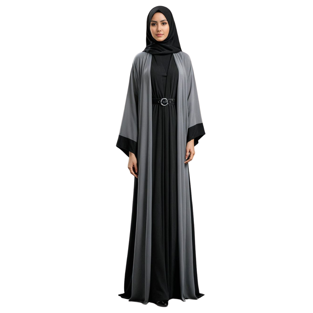 This elegant black and gray abaya blends classic and contemporary style for a refined, modest look. Made from high-quality, lightweight fabric, it offers comfort and a graceful flowing fit for daily wear, office, or special occasions. Subtle design details enhance its chic appeal, making it a versatile wardrobe essential for women who value elegance and mod