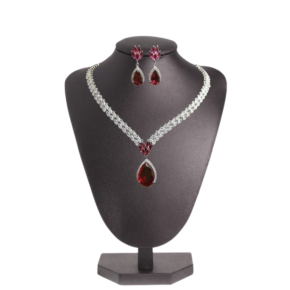 Designed with bold mehroon stones and brilliant accents, this set offers a regal touch that complements formal and festive attire beautifully.